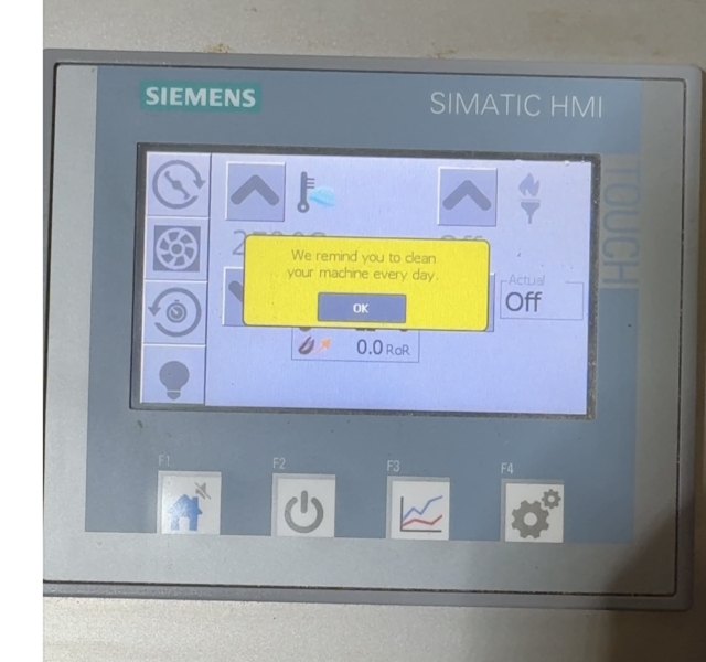 焙煎スルゾーの手順としてコンセント差しましたら、焙煎機本体と接続されている半導体ぎっしりの筐体のタッチパネル液晶が点灯、表示されます(上記写真)